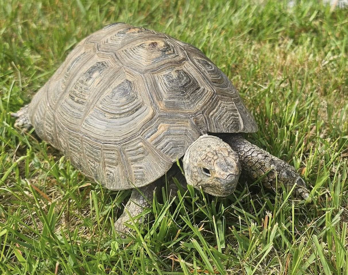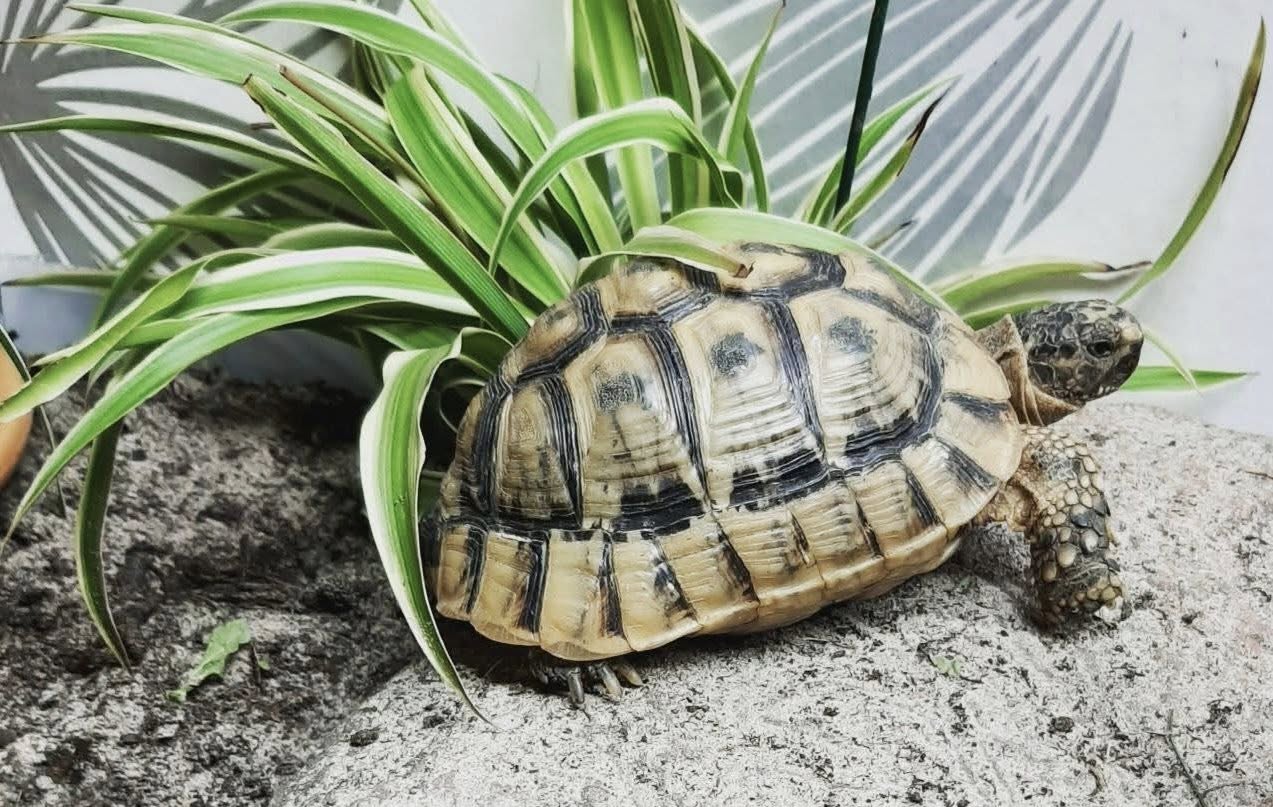 Morisk landsköldpadda (Testudo graeca) har ett stort utbredningsområde runt Medelhavet och Främre Asien och kan ha stor variation i både storlek 15-30 cm och utseende. På fotot nedan så syns tydligt de mörka och ljusare fläckar man ofta kan se hos denna art på huvudet.